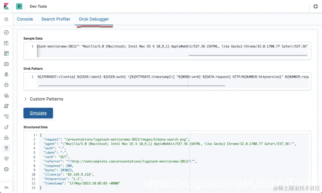 如果大家对 Grok 正则还不是很熟悉的话,有一个 Grok debugger 可以供大家来测试。这个工具已经集成到 Kibana 里面了。