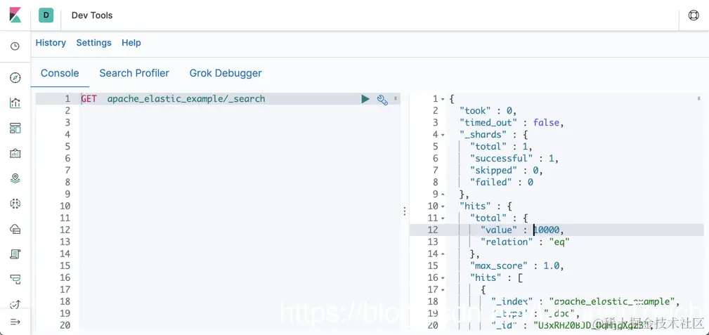 如果我们进行顺利的话,我们已经完成了把 apache_logs 的数据成功导入到 Elasticsearch 之中。根据我们上面的配置文件,这个索引的名字叫做 apache_elastic_example。我们可以在 Kibana 中查看: