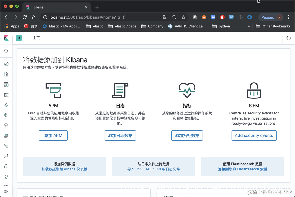 我们最终可以在浏览器中看见我们的 Kibana 被启动的样子: