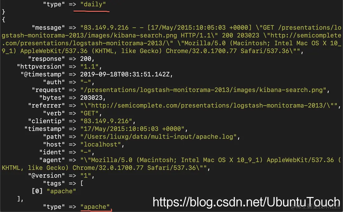 根据显示的结果可以看出来 daily 的事件最早被处理及输出。接着 apache 的数据才开始处理。在实际的应用中,我们可能有不同的数据源,比如来自其它 beats 的监听某个端口的数据。