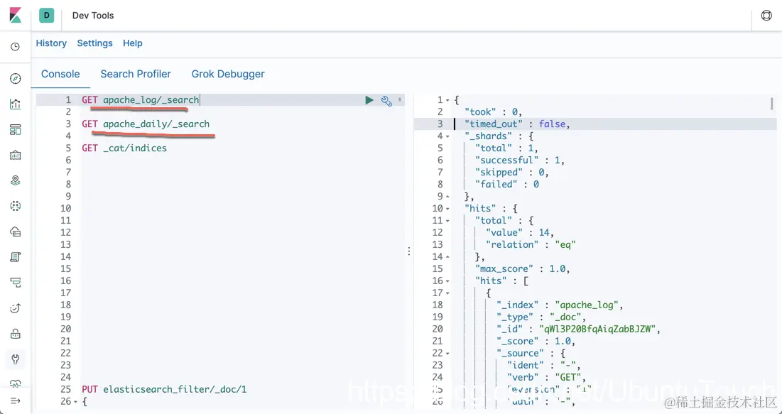 为了说明问题的方便,我们使用了两个 input。它们分别对应不同的 log 文件。对于这两个 input,我们也使用了不同的 type 来表示:apache和 daily。尽管它们的格式是一样的,它们共同使用同样的一个 grok filter,但是我们还是想分别对它们进行处理。为此,我们添加了一个 tag。我们也可以添加一个 field 来进行区别。在 output 的部分,我们根据在 filter 部分设置的 tag来对它们输出到不同的 index里。