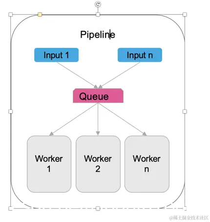 这里的 input 可以支持多个 input,同时多个 worker 可以处理 filter 及 output: