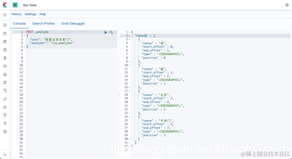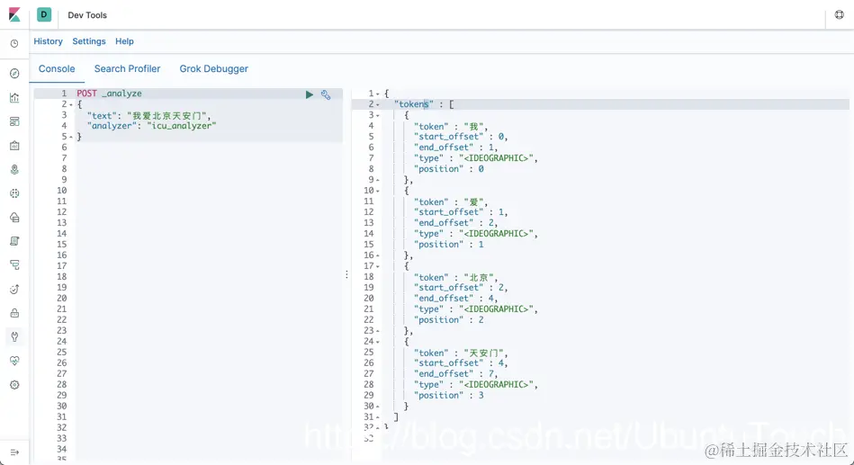等我们完全安装好了 analysis_icu,那么,我们可以使用如下的例子在 Kibana 中来做一个实验: