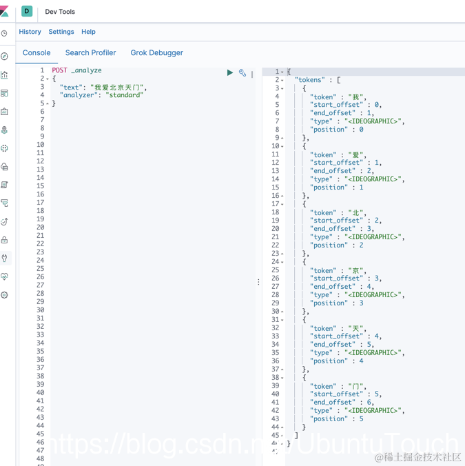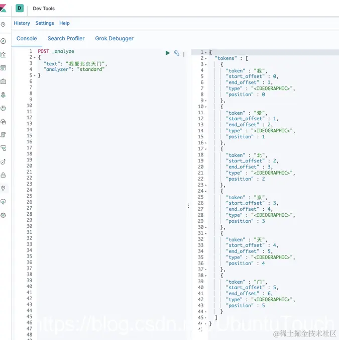 上面显示,我们 analysis 可以正确地帮我们把中文词语安装中文的分词方法正确地进行分词。