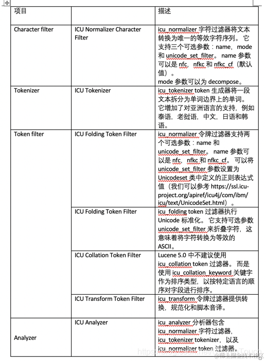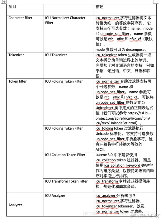ICU Analysis 插件是一组将 Lucene ICU 模块集成到 Elasticsearch 中的库。 本质上,ICU 的目的是增加对 Unicode 和全球化的支持,以提供对亚洲语言更好的文本分割分析。 从 Elasticsearch 的角度来看,此插件提供了文本分析中的新组件,如下表所示: