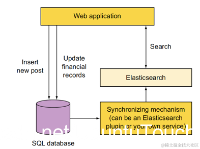 在这种架构中,您有两个数据存储,必须找到一种使它们保持同步的方法。 根据您的主要数据存储区和数据布局方式,您可以部署Elasticsearch插件以使两个实体保持同步。