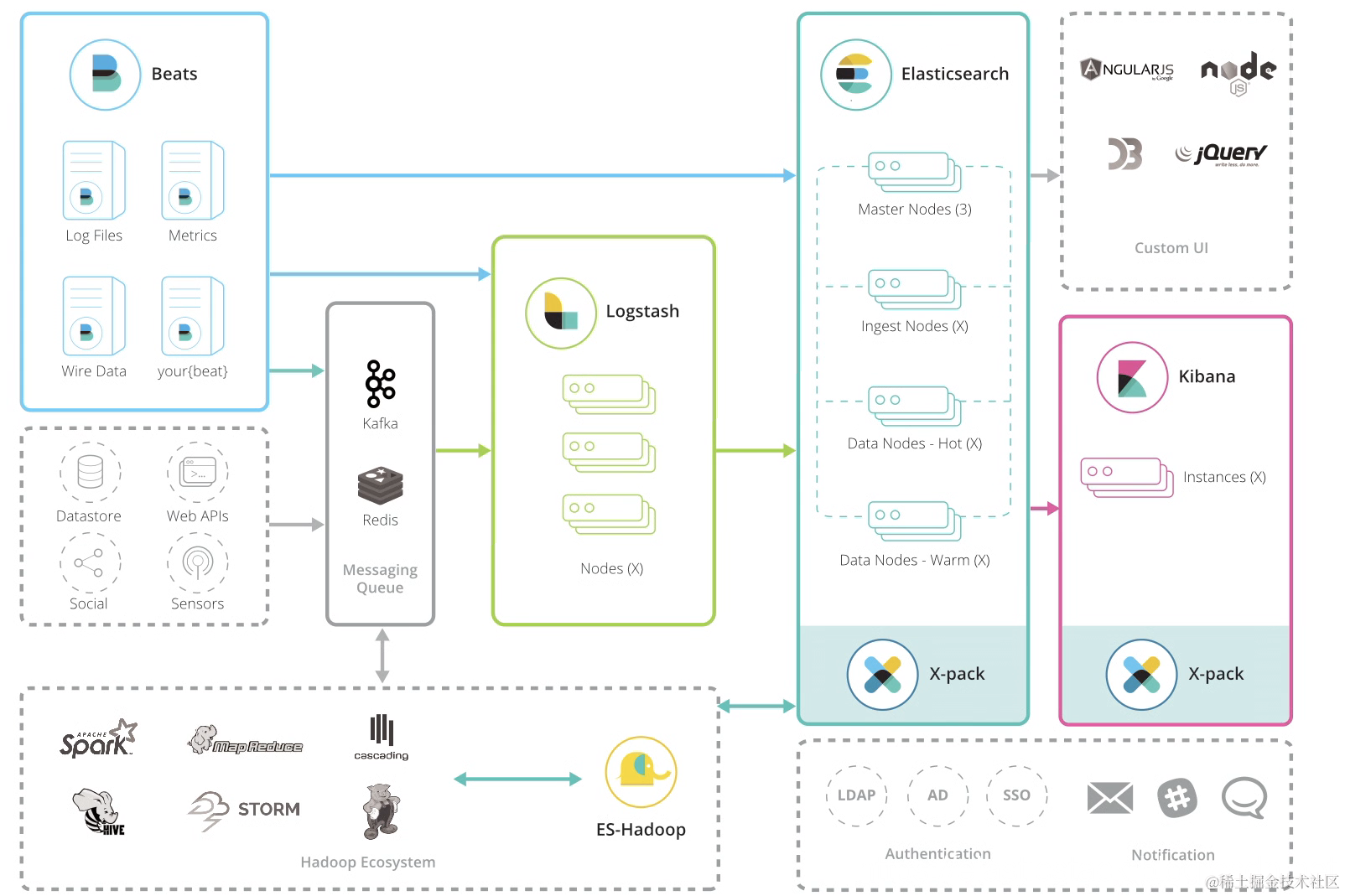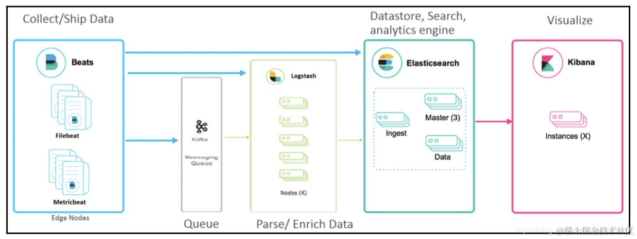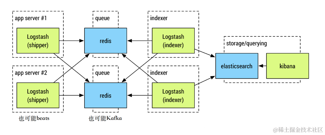 下图描述了常用的Elastic Stack的部署架构: