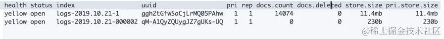显然它和之前的 14074 个文档多增加了一个文档,也就是说 log_alias 是同时指向 logs-2019.10.21-1 及 logs-2019.10.21-000002。