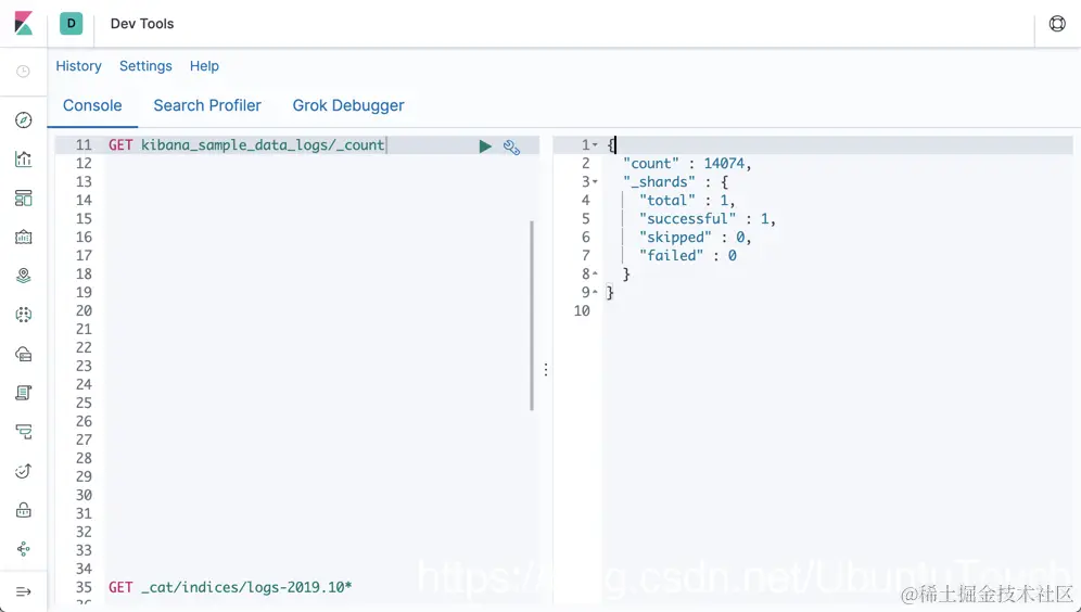 它显示 kibana_sample_data_logs 具有 11.1M 的数据,并且它有 14074 个文档: