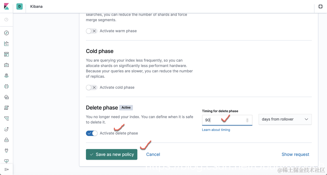 - 当一个 index 创建的时间超过90天,那么也自动删除
