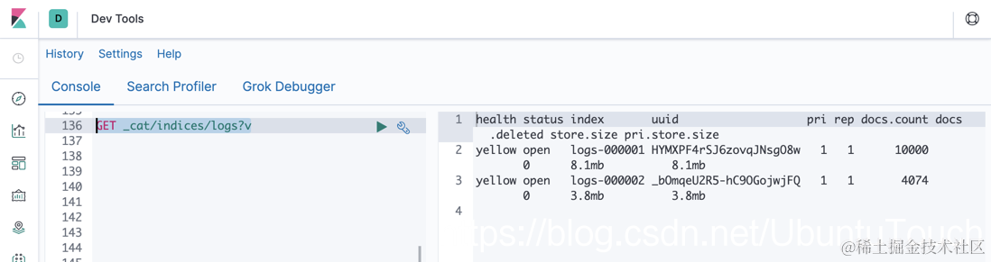 我们可以看到 logs-000001 索引中有10000个文档,而 logs-000002 中含有4074个文档。