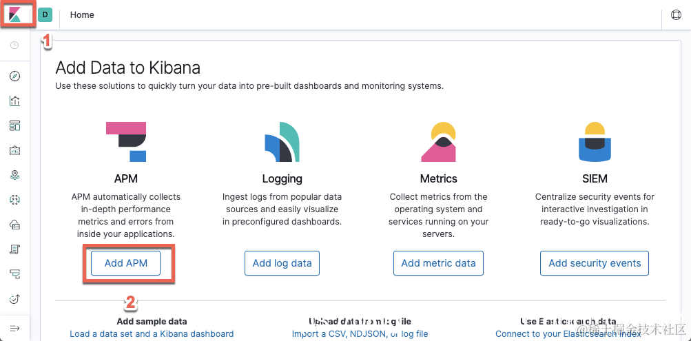 我们也必须安装和 Elasticsearch 一样版本的 APM 服务器。我们打开我们的 Kibana 界面,并点击左上角的部分: