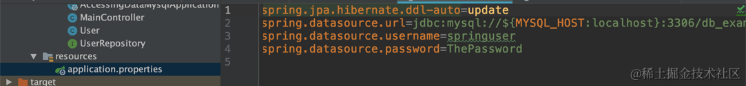 上面的命令创建了一个叫做 db_example 的数据库。同时,它也创建了一个叫做 springuser 的用户及其密码 ThePassword。一定要记住这里的用户名和密码要和我们在上面的 Java 应用中的用户名及密码是一致的: