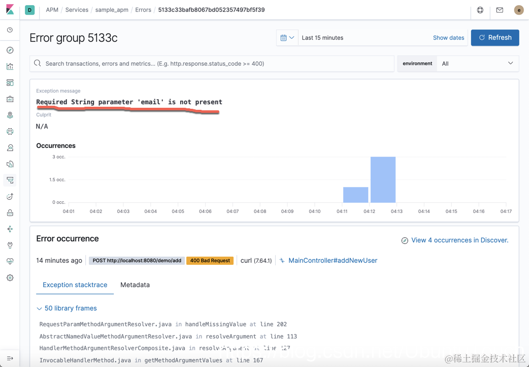 Elastic APM 还会自动收集未处理的错误和异常。 错误主要根据堆栈跟踪进行分组,因此你可以在新错误出现时识别它们,并密切注意特定错误发生的次数。
