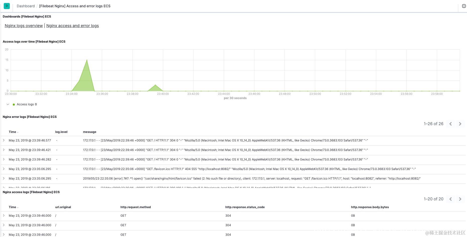 Metricbeat 将收集与连接相关的数据(活动、已处理、已接受等),以及客户端请求的总数。Filebeat 将收集与访问日志和错误日志相关的数据。收集的信息会因不同的设置而有所变化,但在大多数情况下,我们可以使用这些信息来推断某些事情,例如: