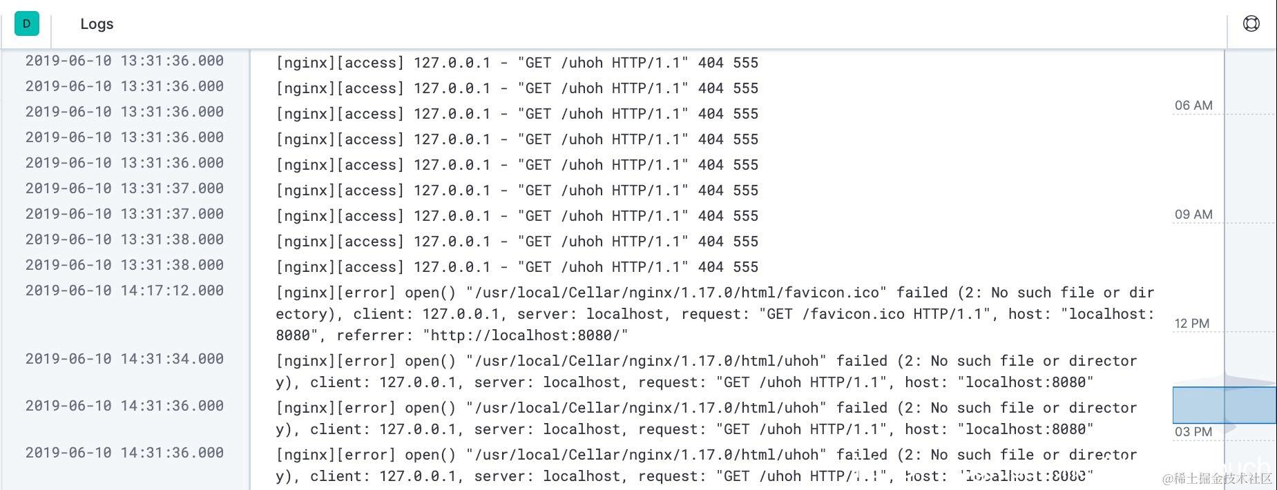 如果导航到“Logs”(日志)应用,我们将能够看到从 Filebeat 发送来的访问日志和错误日志。