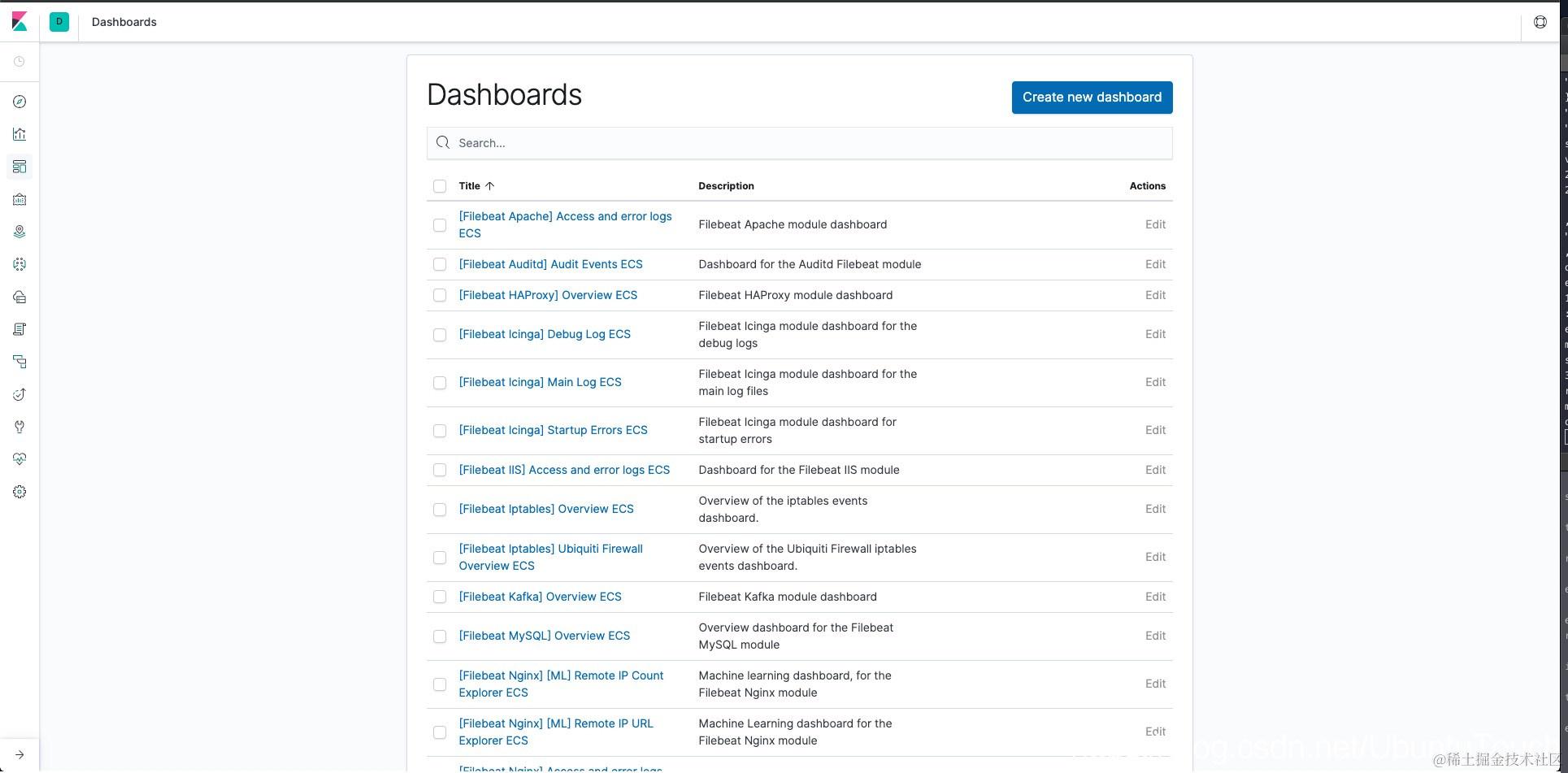 现在,如果我们导航到 Kibana 中的“Dashboards”(仪表板)选项卡,应看到以下内容: