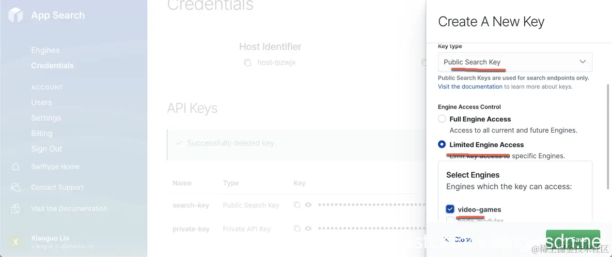 使用仅对video-games引擎具有Limited Engine Access的方式创建新的Public Search Key。