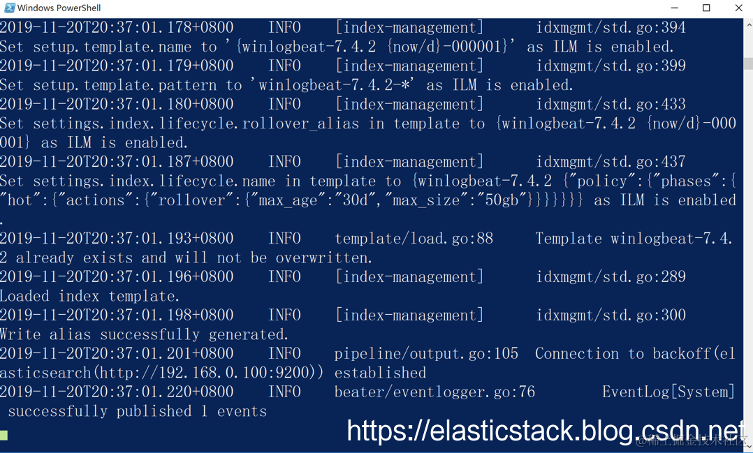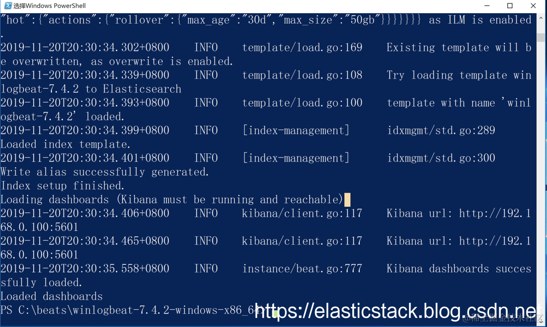 完成后,保存文件,然后在主机上以管理员身份打开 PowerShell 窗口。 我们想要将必要的 Winlogbeat 模板上载到 Elastic 栈中,以进行正确的解析。 在此窗口中,导航到Winlogbeat 文件夹并运行以下命令: