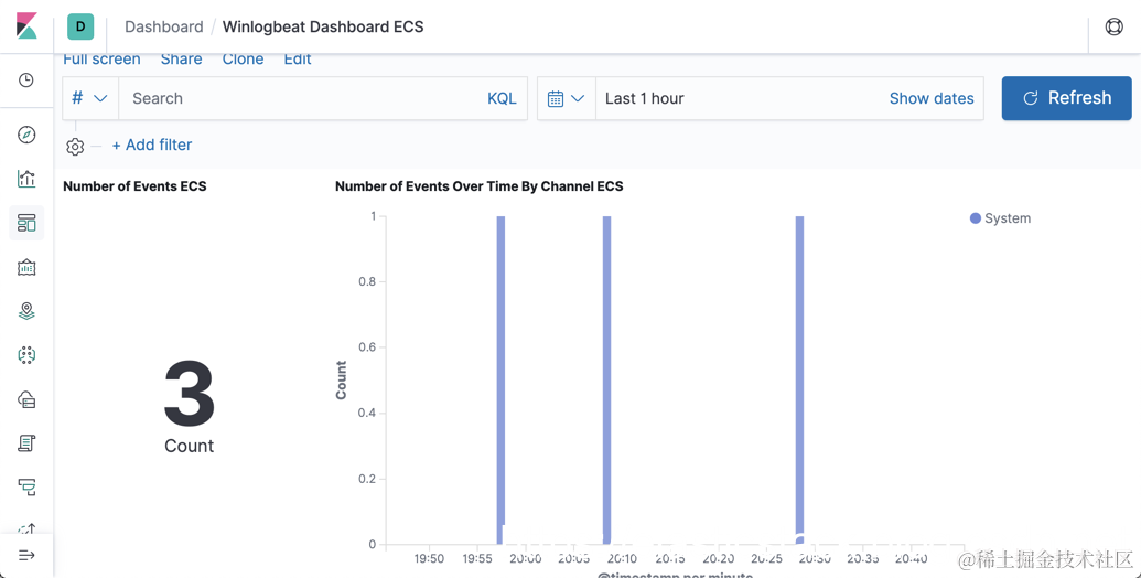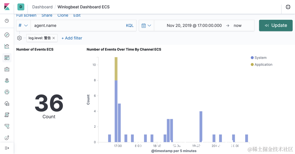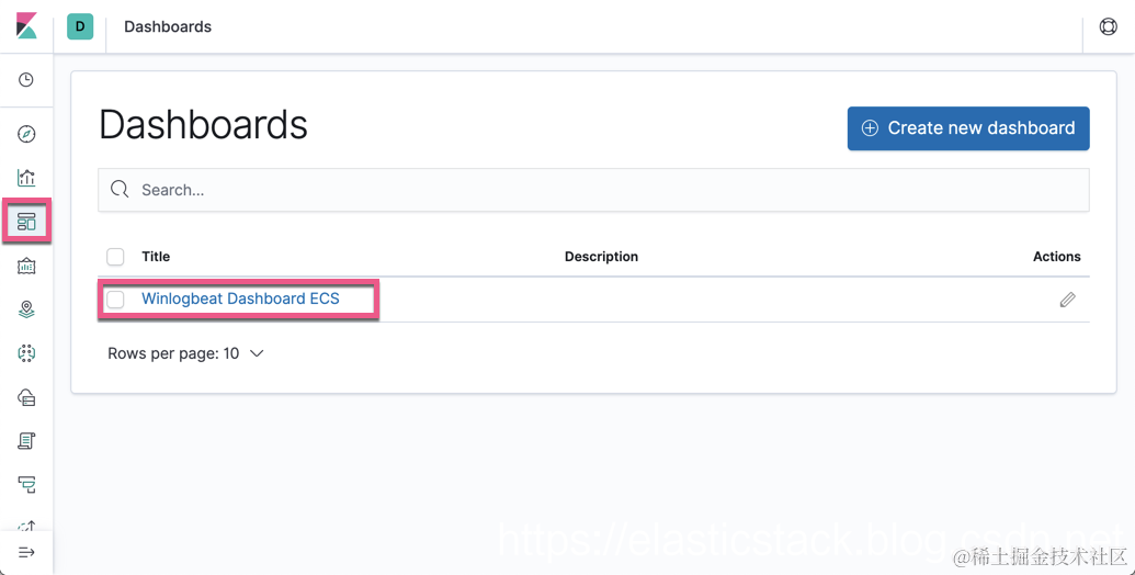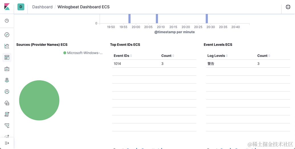 在之前我们已经对 Kibana 的 dashboard 进行了配置,那么我们现在直接点击 Dashboard,并选择 Winlogbeat Dashboard ECS: