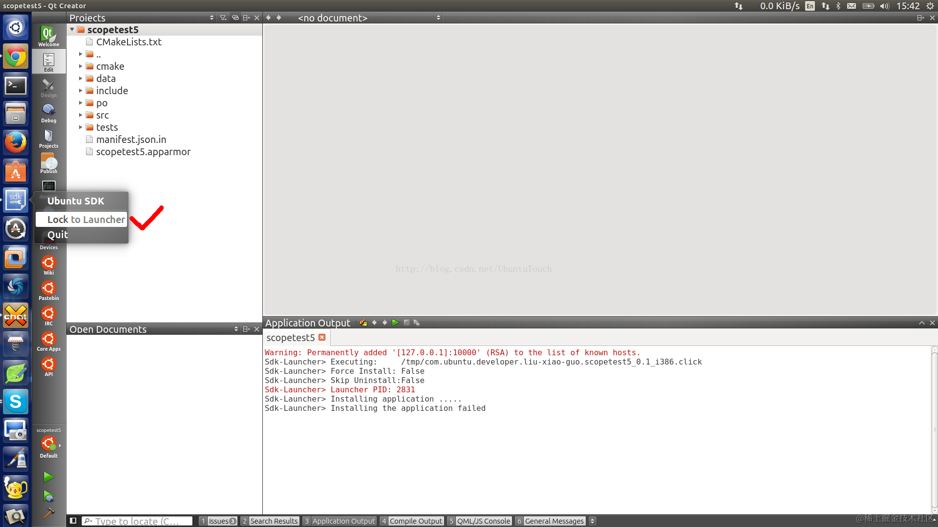 提示:对一些开发者来说,他们可能很想让 Ubuntu SDK IDE的图标出现在Ubuntu Unity 的启动面板中,这样可以每次很方便地启动。只要先启动SDK,然后在Ubuntu桌面的左侧的启动面板中,找到SDK的图标,并按下右键,然后选定" Lock to Launcher"。这样,SDK 就可以固定在启动的面板中了。