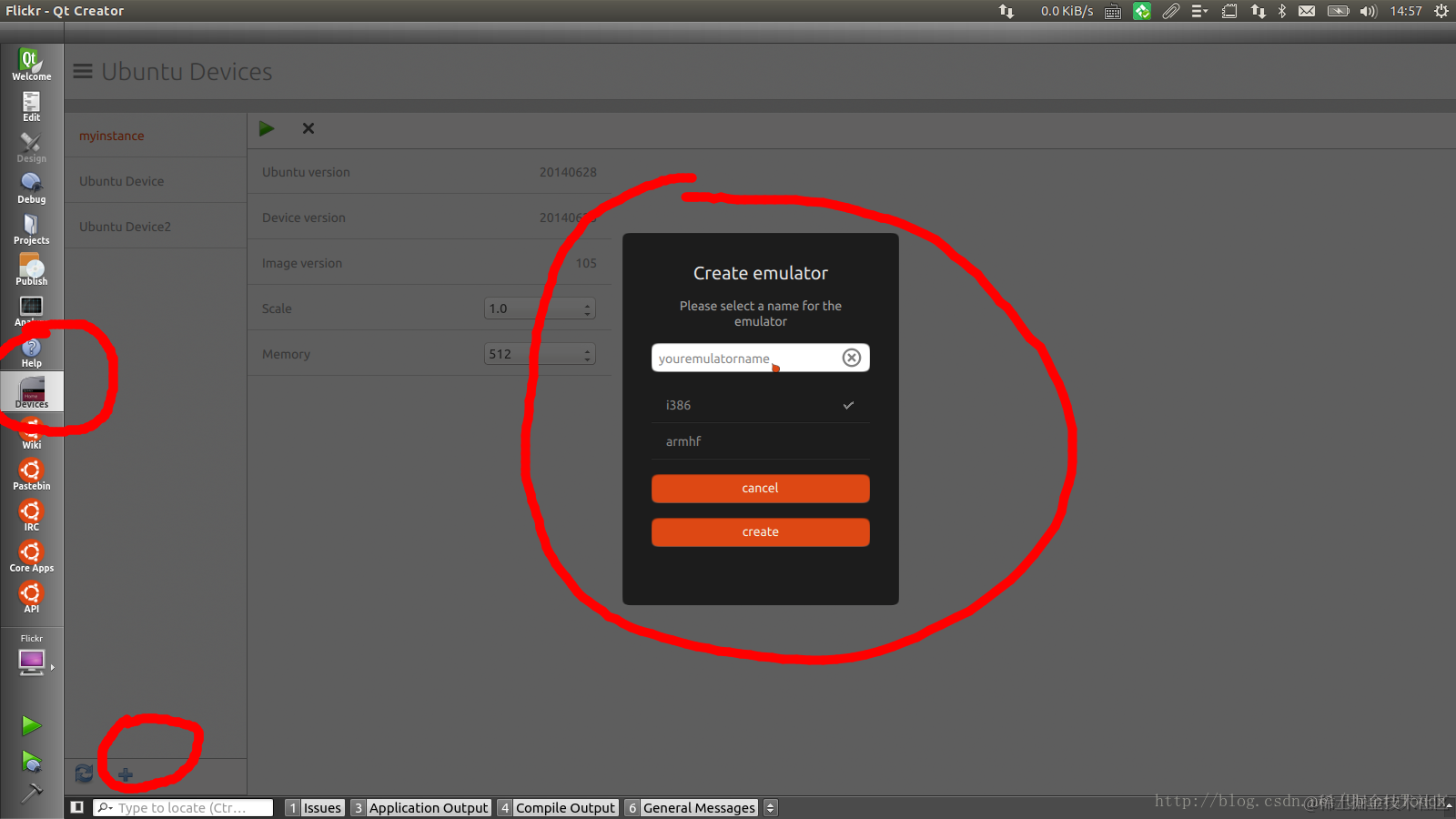 - 在所显示的对话框中,输入所需要的模拟器的名字。选择"i386",然后点击"Create"即可。整个过程可能会花很长的时间完成。请耐心等待。这个安装虽然也可以选择"armhf"来进行模拟,但目前建议的还是"i386"架构。