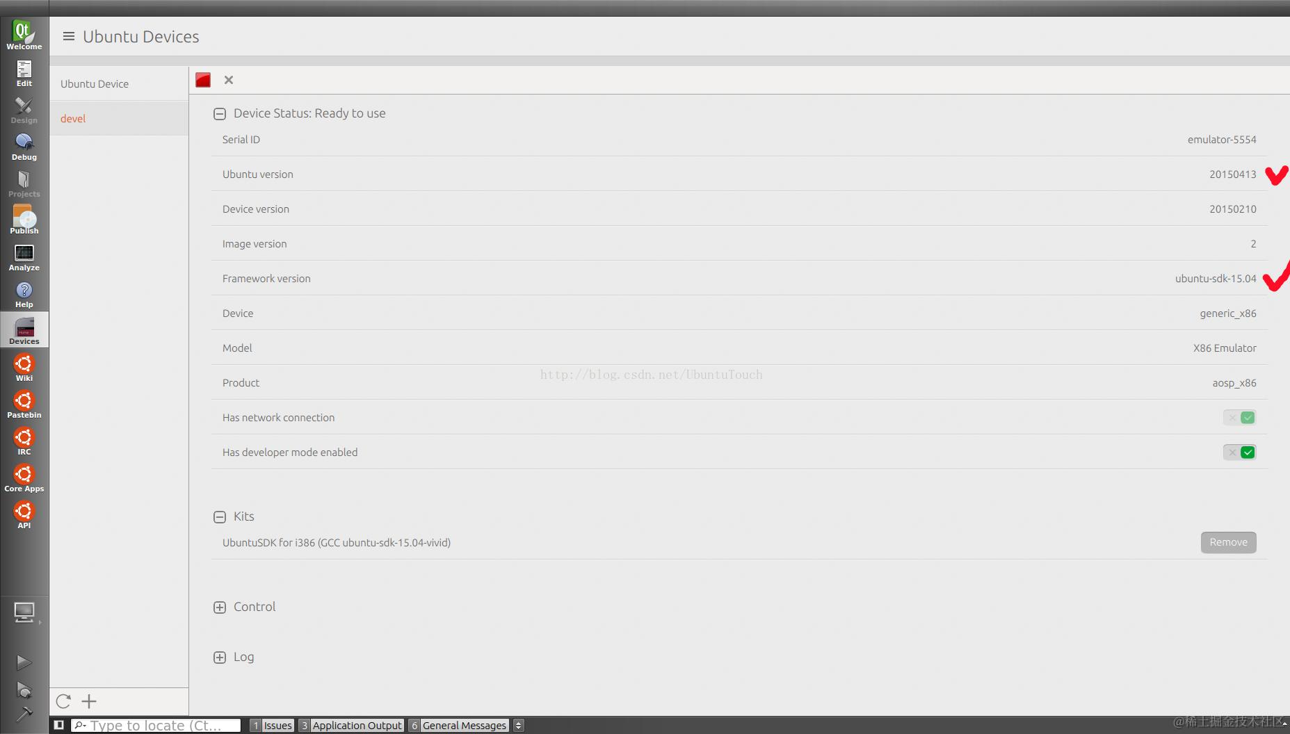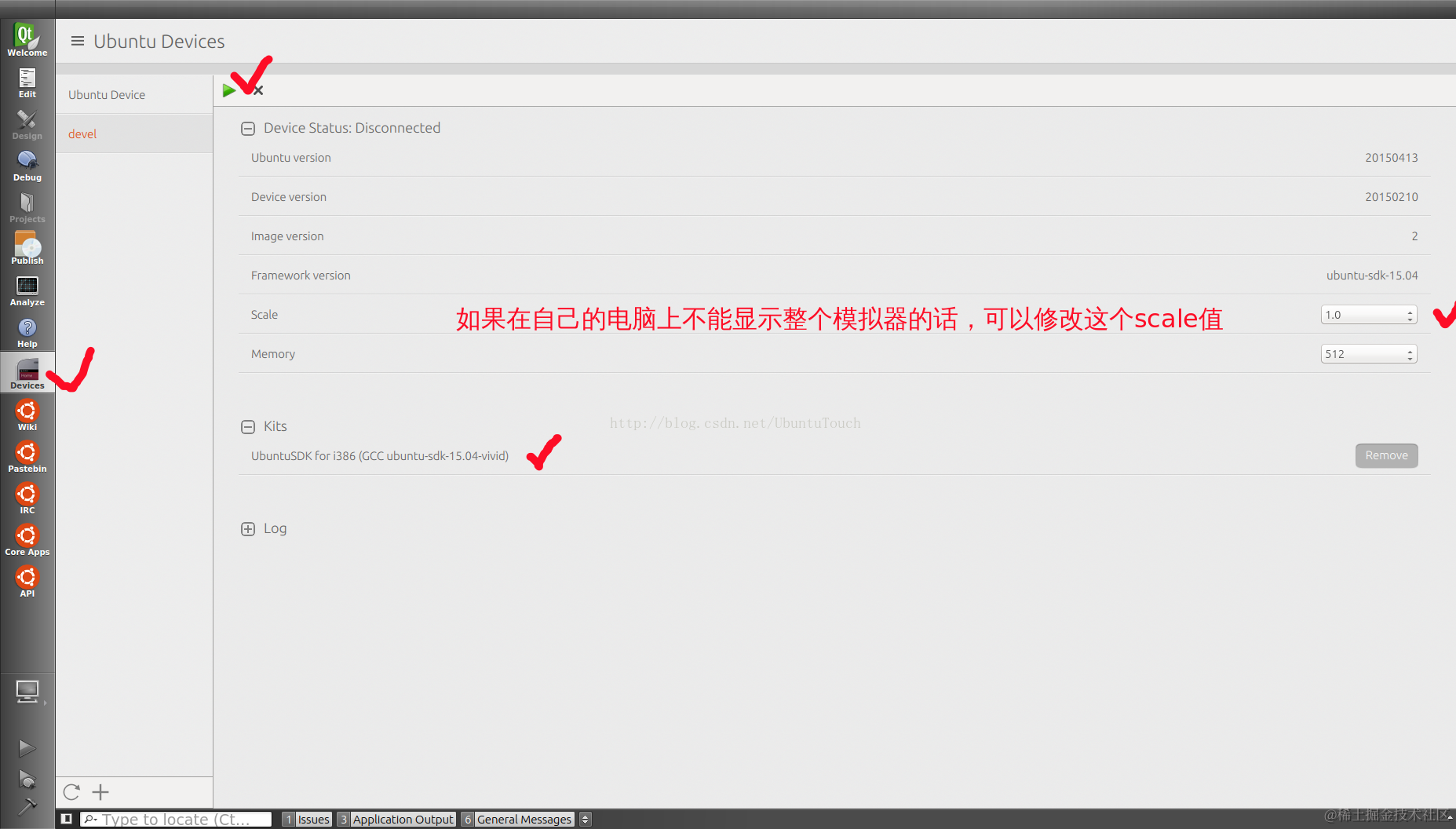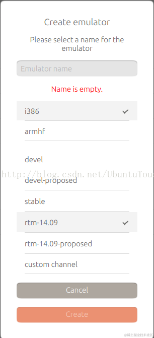 注意当我们安装摸拟器时,我们可以选择“ devel”或“ stable” channel(stable是最新Ubuntu的官方发行版,devel是最新经过验证的daily build)。“ devel-proposed”是包含最新变化的发行版,比如当前的15.04的版本。这个版本还需要被验证,并且可能有bug。