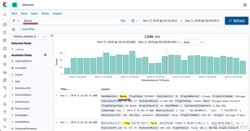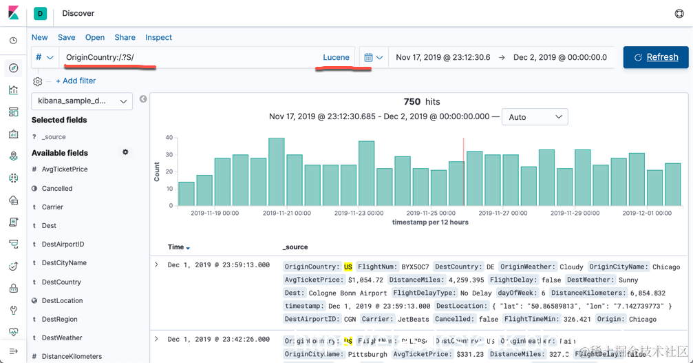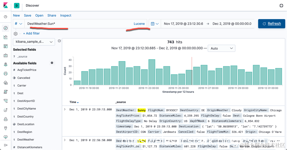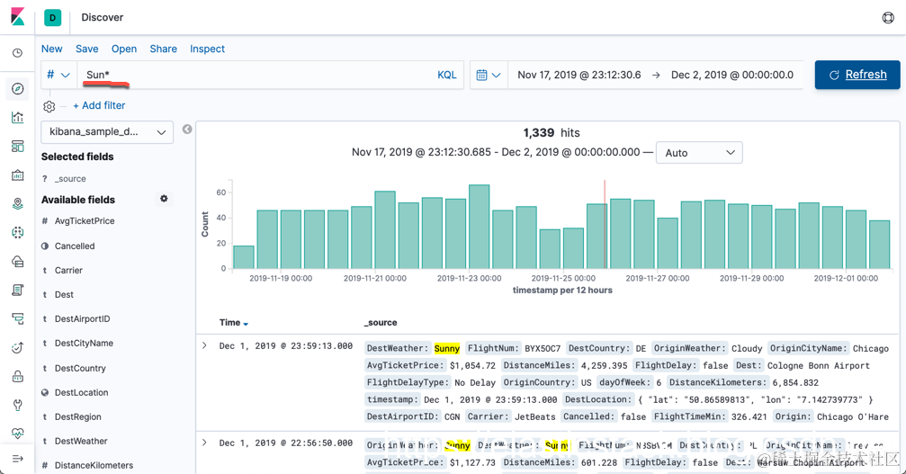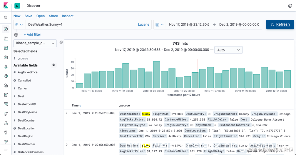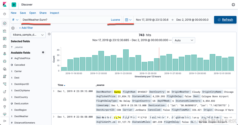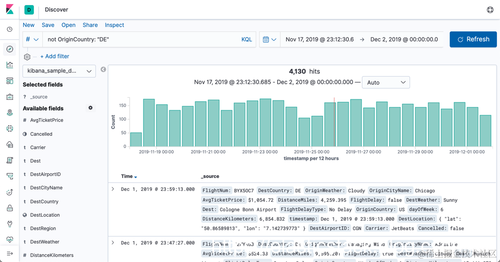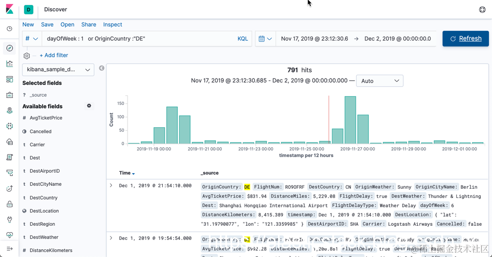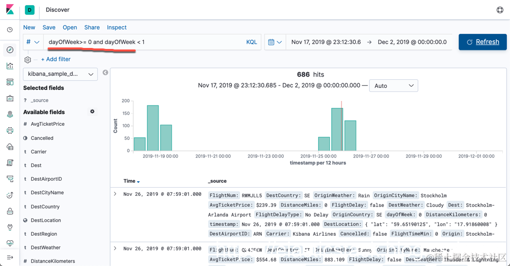 在上面我们可以看到,当我们使用 KQL 时,一个很大的好处是它可以帮我们自动提示我们想要搜索的字段,具有自动补全的功能。比如我们打入 day 时,Kibana 会自动弹出选项让我们进行选择。