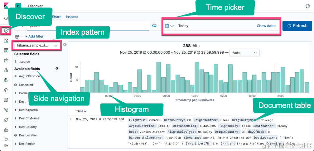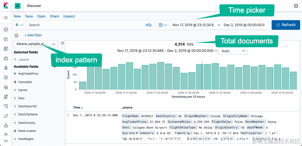 - Time picker:对于 time series (时序)数据来说,这个非常重要。如果没有选好对应的时间,可能在 Kibana 中没有任何的数据。