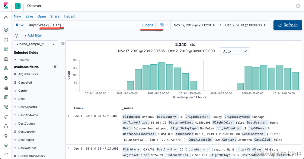 在上面,如果我们不想包括 3 的话,我们应该写为:dayOfWeek:[0 TO 3}。你也可以写从 3 向上的任何值: