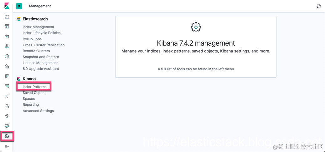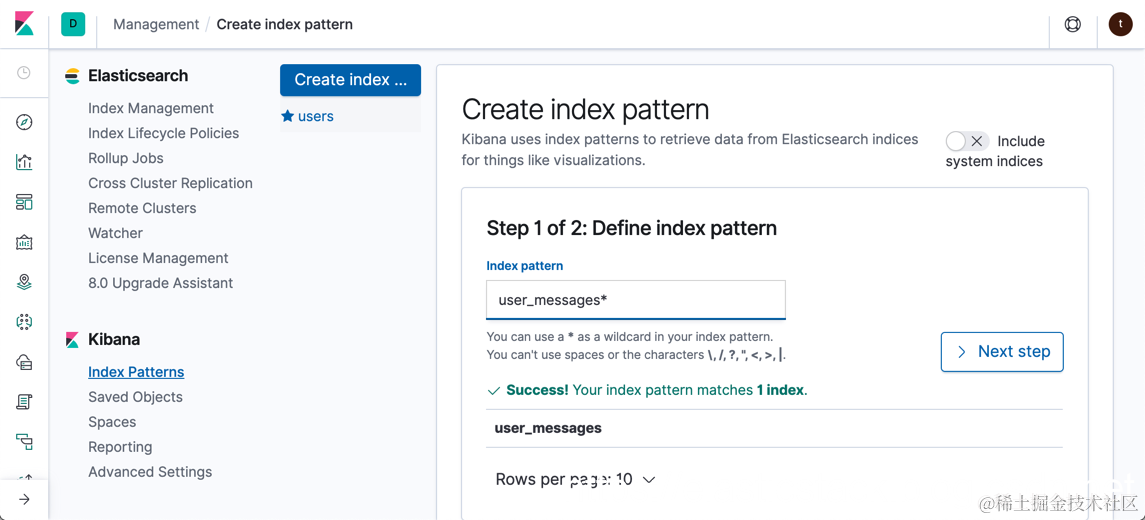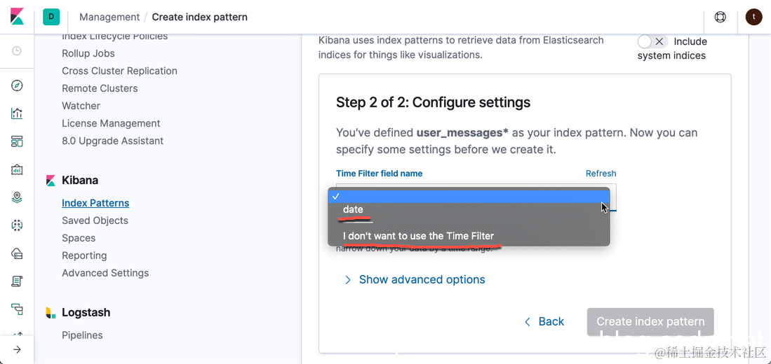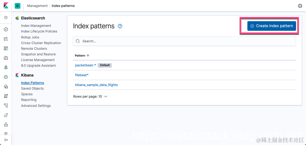 从上面我们可以看出来,所有是的索引存在于 Elasticsearch 之中,我们需要 Index pattern 让 Kibana 来对这个索引进行操作。