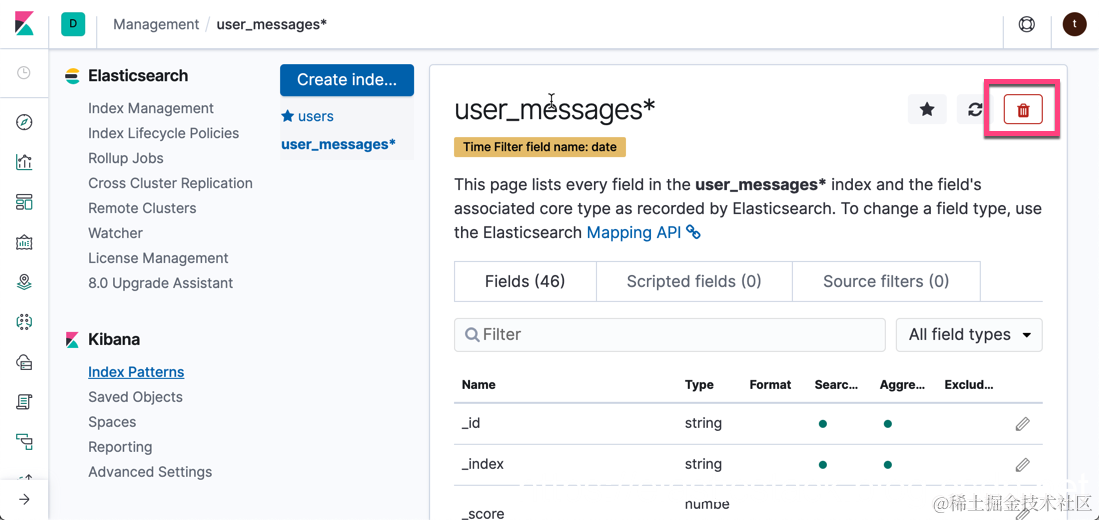 如果我们想删除一个 Index pattern,我们也可以在上面的页面中选择删除即可: