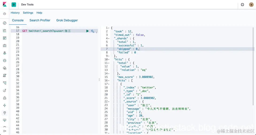 我们通过 “q=user:张三” 查询到我们所需要的文档。在有的时候这是一种非常快的查询方式。我们也可以在浏览器中直接打入一个这样的 URI: