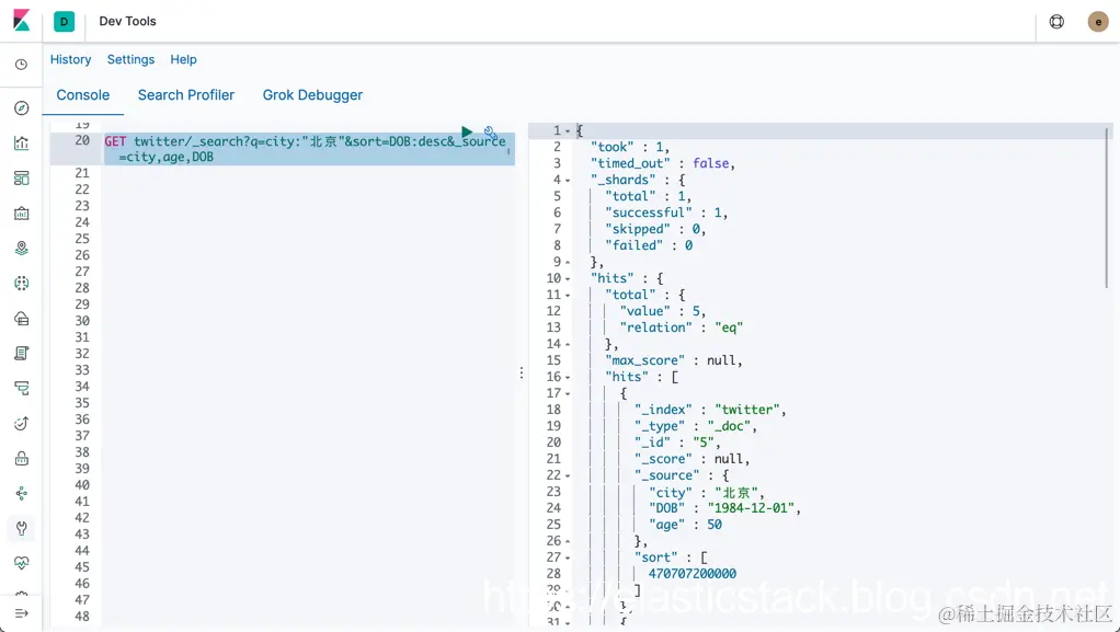 GET twitter/_search?q=city:"北京"&sort=DOB:desc&_source=city,age,DOB