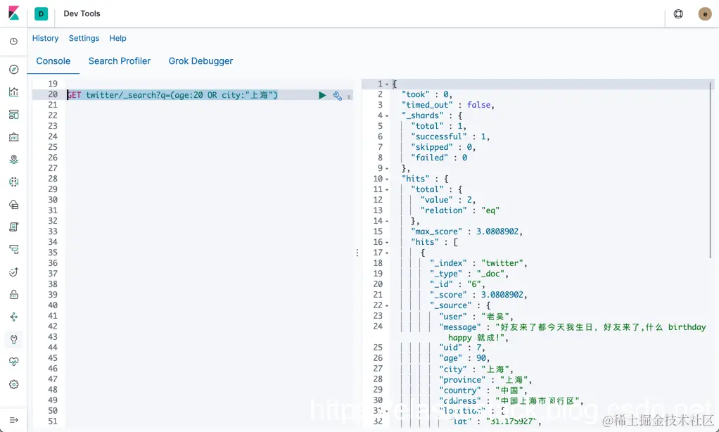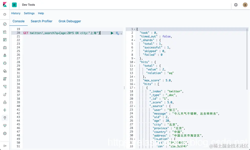 GET twitter/_search?q=(age:20^5 OR city:"上海")