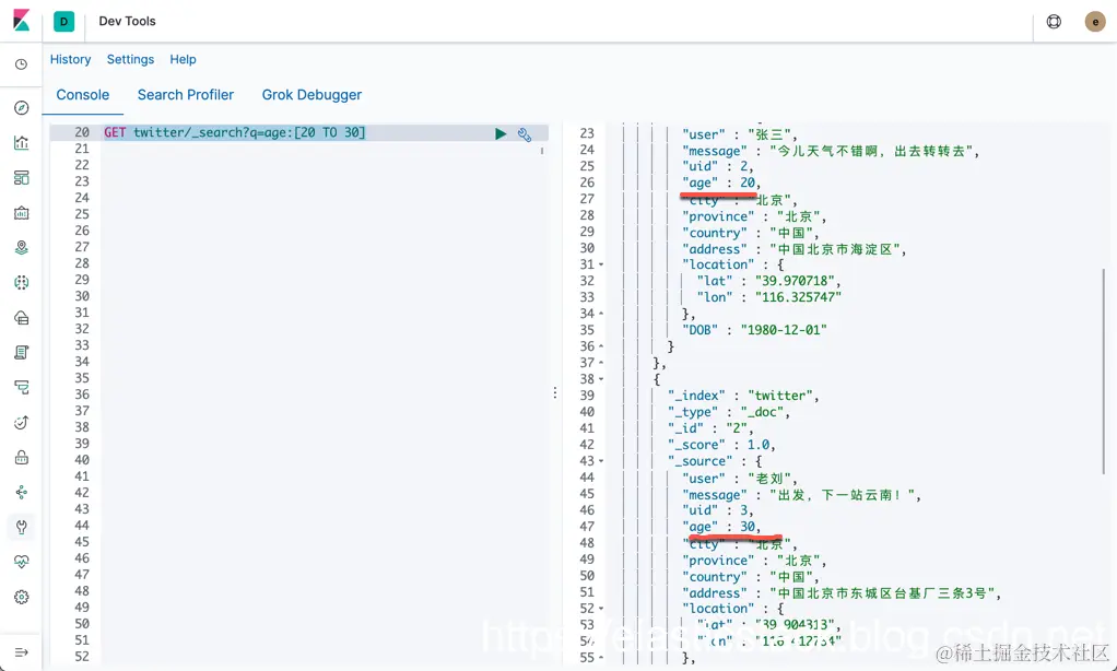 上面搜索的结果是从20岁到30岁的所有的结果,并且都包含在里面。我们如果不想包含30岁的话,那么可以写成这样的格式:
