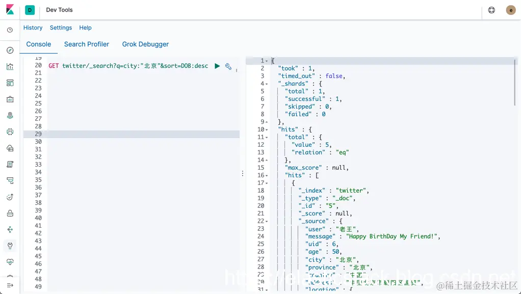 GET twitter/_search?q=city:"北京"&sort=DOB:desc