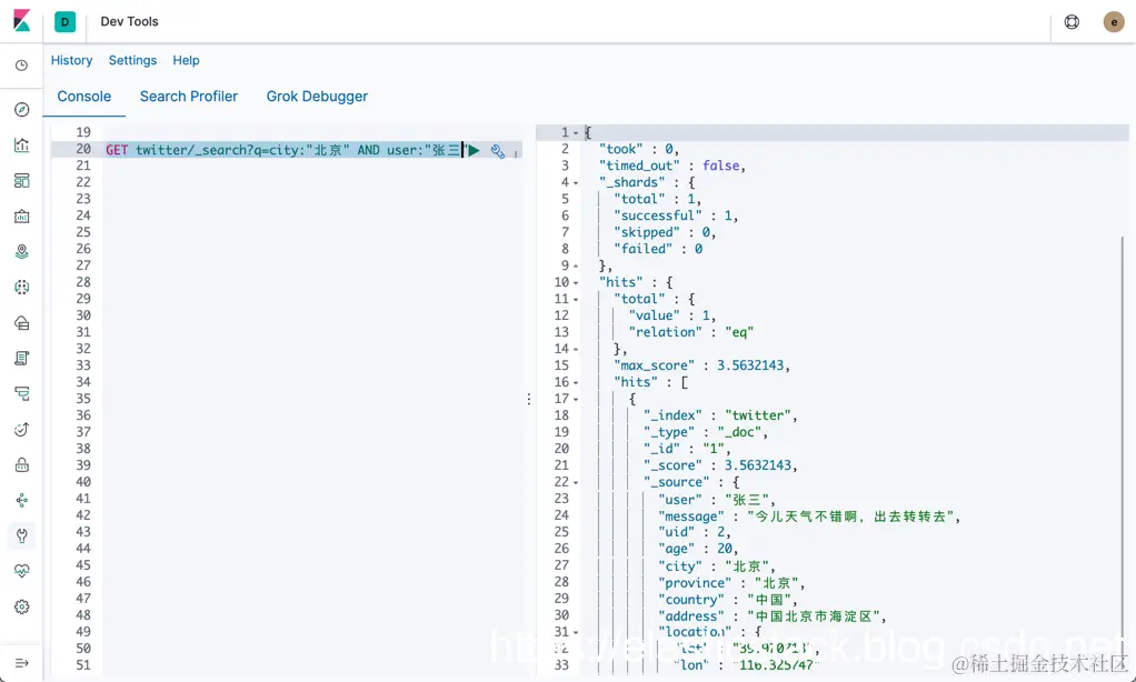 GET twitter/_search?q=city:"北京" AND user:"张三