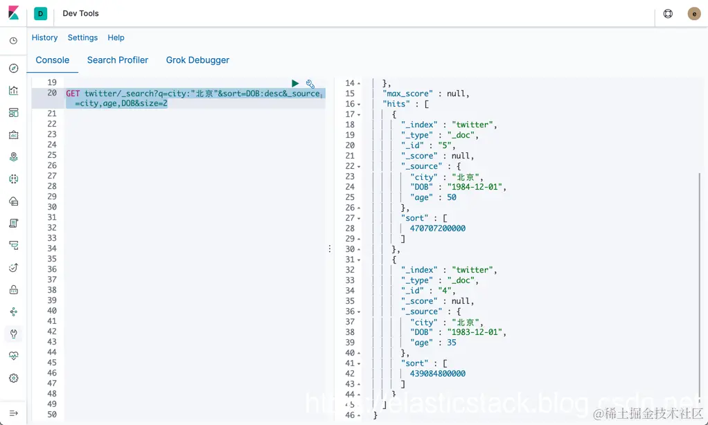 GET twitter/_search?q=city:"北京"&sort=DOB:desc&_source=city,age,DOB&size=2