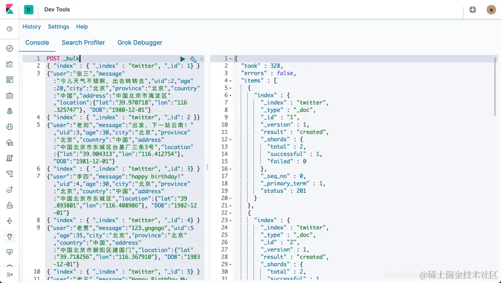 为了说明问题的方便,我们首先在 Kibana 中使用如下的 bulk 指令来创建我们的 twitter 索引。