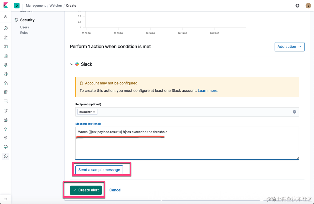 我们可以选择Send a sample message按钮来测试一下我们的Slack配置是否成功。最后,我们选择Create alert。这样就创建了一个Watcher。