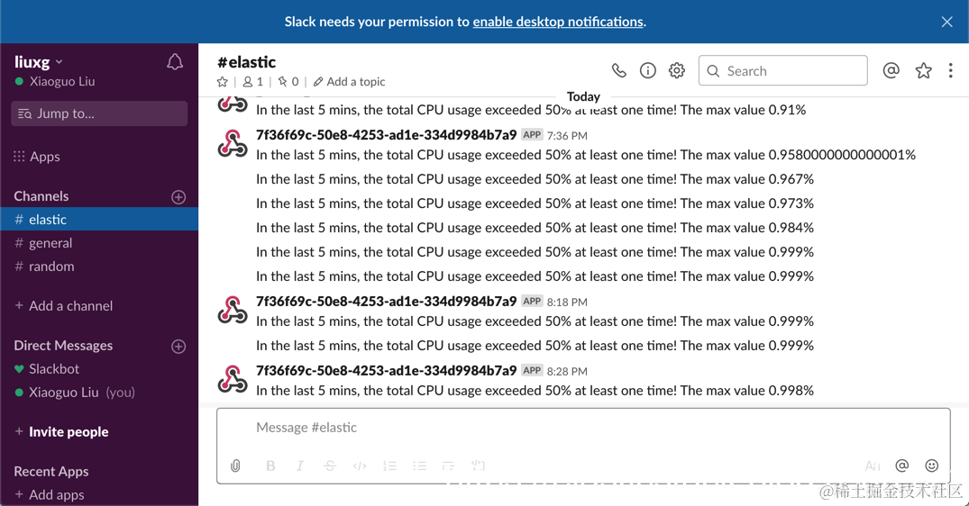 我们可以在Watcher页面看到我们配置的每个Watcher。上面显示我们的其中的一个watcher已经发送通知了,而且是4分钟之前发送的。我们可以在我们的Slack界面看到如下的消息: