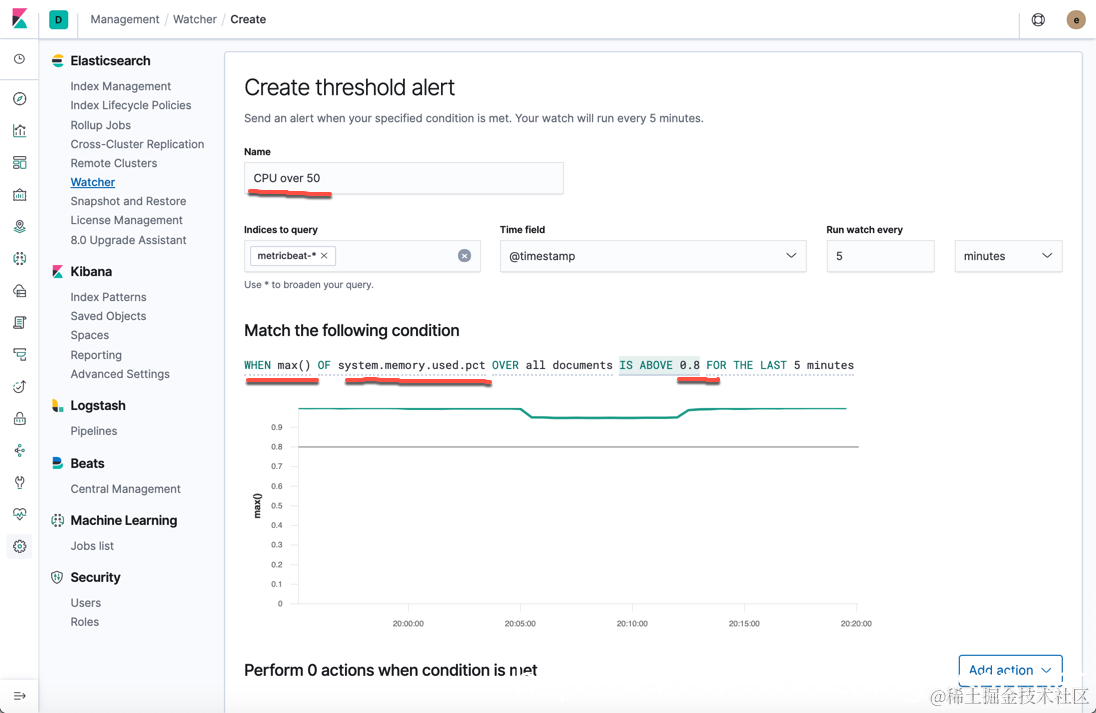 由于很难为所有类型的警报构建通用的UI,因此Elastic决定首先针对最常请求的警报处理UI:当指标超过或低于给定阈值时触发的简单阈值警报。