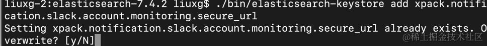 在这里,我们选择y。如果你是第一次运行这个命令的话,就不会有这样的一个提示了。你可以把你从Slack中配置的那个Webhook URL复制并粘贴到这里。这样我们的配置就完成了。然后,我们启动Elasticsearch。