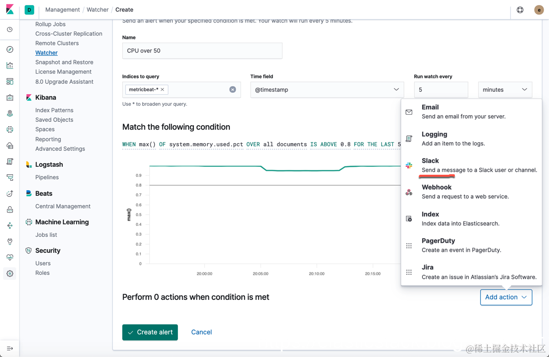 我们点击Create,然后,我们就可以开始配置我们的一个watcher了。我们选择Create threashold alert: