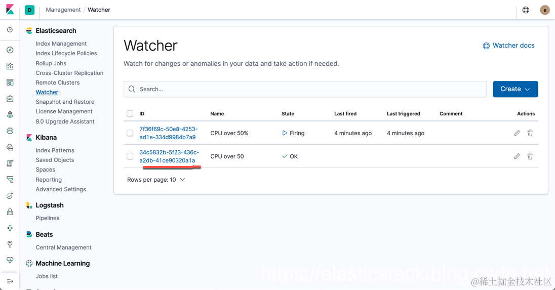 打开浏览器并导航到Kibana。单击侧面导航栏中的“Management”应用程序,然后单击Elasticsearch标题下的Watcher。