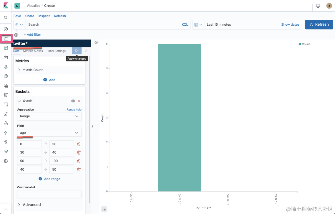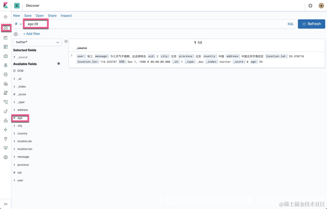 显然,这个时候,我们可以通过 age 来搜索我们的 index。但是必须记住的,这个新生成的字段只限于 Kibana 使用,并不会写回 twitter 索引,并生产相应的 token。