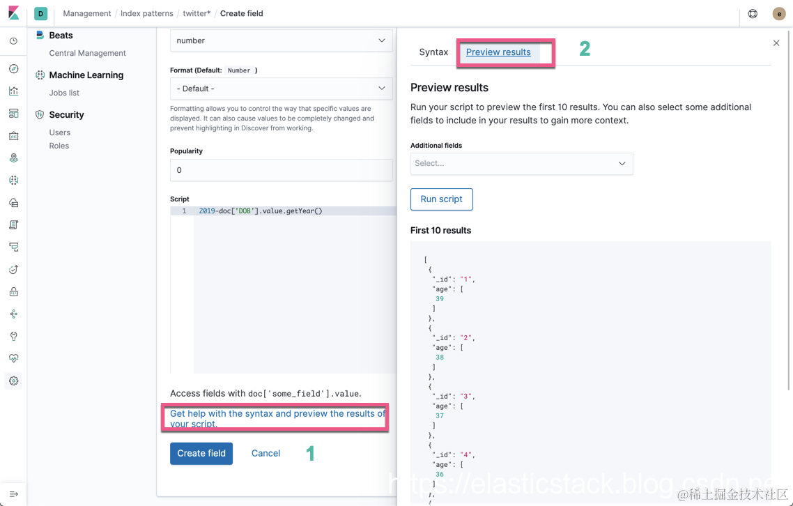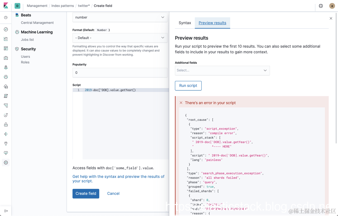 我们可以选择 Preview Results 来进行查看我们的结果。如果没有错误,那么我们可以看到输出的值。加入我们把脚本改为 2019-doc['DOB].value.getYear() 的话,显然这个是一个错误的脚本,在 DOB 那里少了一个引号。我们重复刚才的动作,那么: