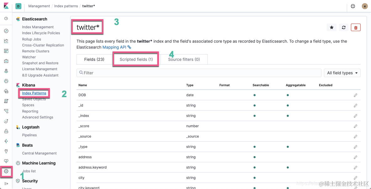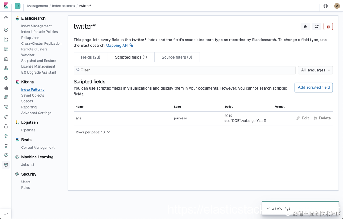 我们选中Twitter index pattern。如果大家不知到什么是Inxdex pattern和如何生产Index Pattern,请参阅我之前的文章“Kibana: 如何使用Search Bar”。我们点击Scripted Field:
