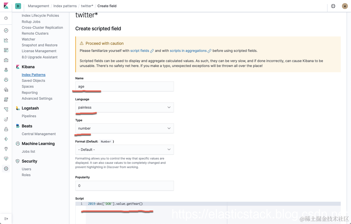 如上所示,我们想创建一个叫做 age 的 scripted field。它的值是 2019-doc['DOB'].value.getYear(),也就是用我们当前的年份减去生日的年份。由于这个脚本没有验证,有可能出现错误,那么我们如何测试它呢?